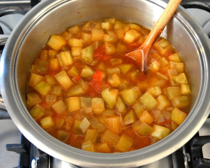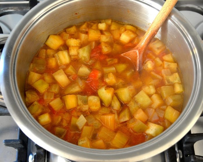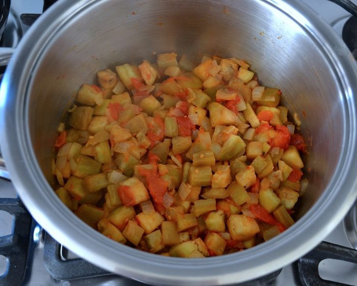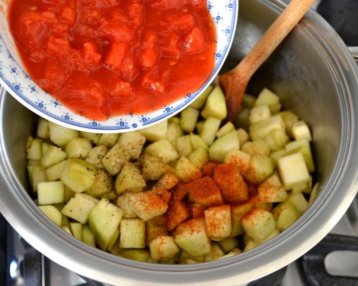 Помидоры нарезать кубиками и добавить к овощам (можно использовать свежие помидоры, которые предварительно надо обдать кипятком и очистить от кожуры и семян). Положить корицу и паприку, поперчить по вкусу.
