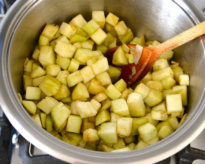 Переложить обжаренный лук в кастрюлю, где будем варить суп. Баклажаны промыть от соли и переложить в кастрюлю с луком. Перемешать.