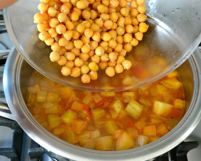 Консервированный нут промыть и добавить в кастрюлю. Можно использовать предварительно отваренный нут.