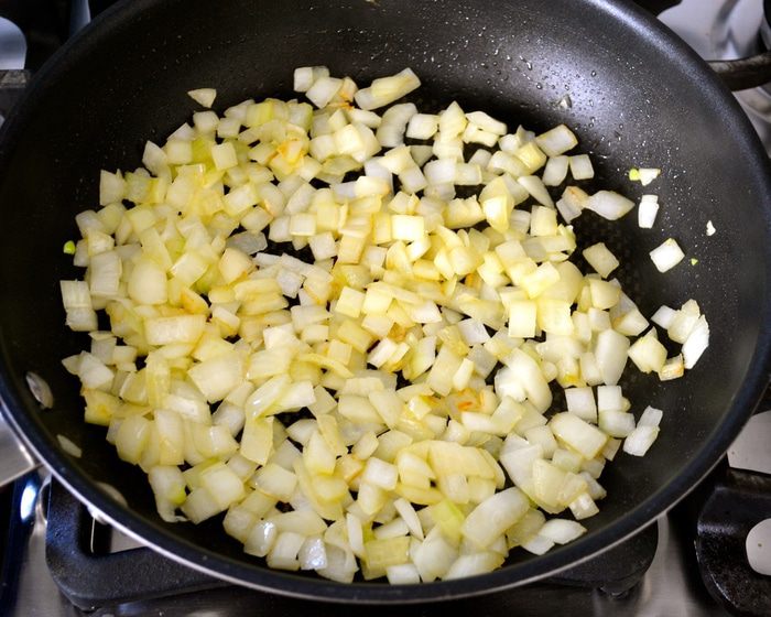 Тем временем лук нарезать кубиками и слегка обжарить на оливковом масле до легкого золотистого цвета.
