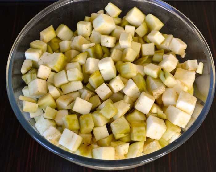 Баклажаны очистить от кожуры и нарезать небольшими кубиками. Положить в миску и пересыпать солью. Временно отставить.