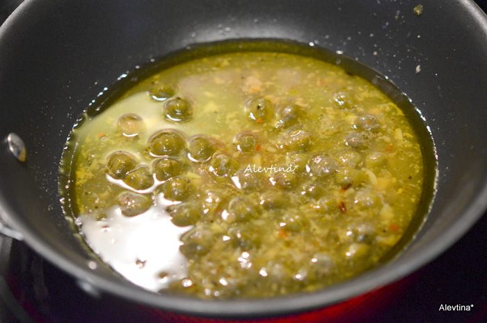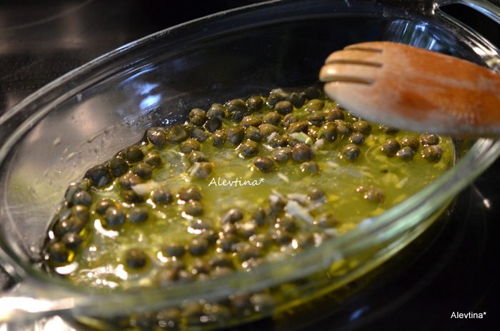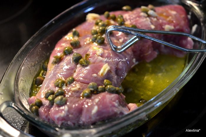Смешать в емкости или в пакете каперсы с жидкостью, баночка примерно 1/2 стакана, лимонный сок, оливковое масло, чеснок мелко порубленный.