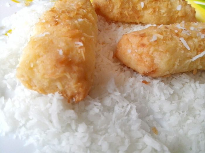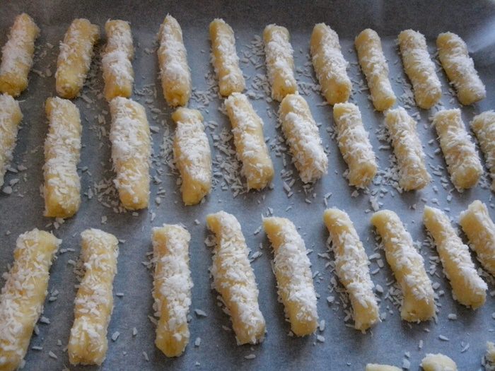 Обваливаем каждую палочку в кокосовой стружке (оставшиеся 50 грамм) и отправляем на противень, выстланный бумагой для выпечки.