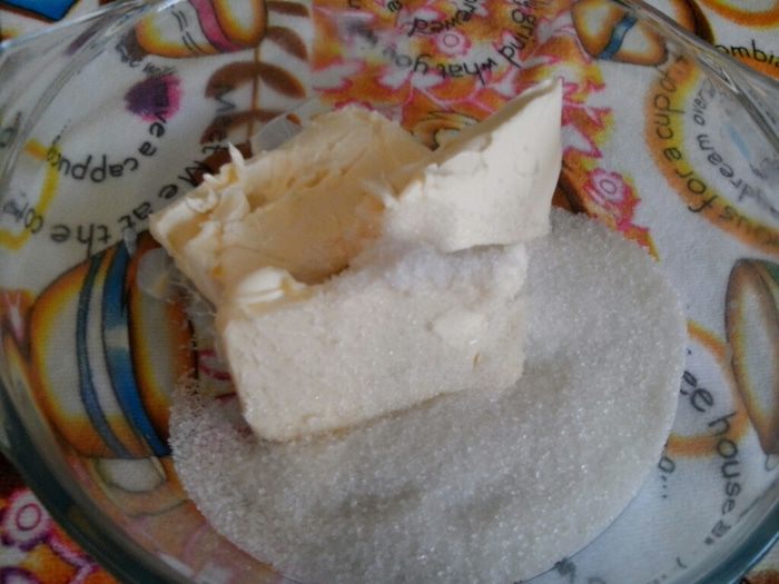 Размягченный маргарин или сливочное масло взбить с сахаром.
