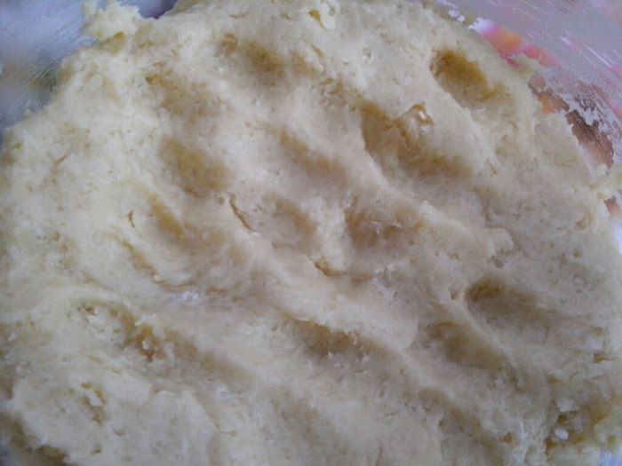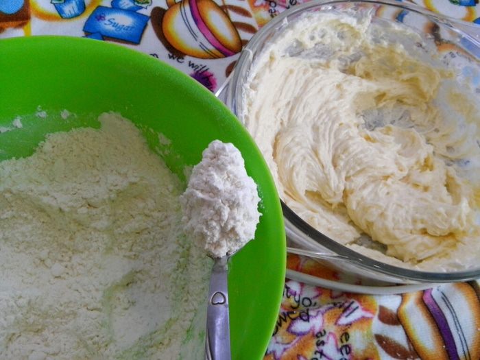 Добавляем к маргарину постепенно сухую смесь, вымешивая тесто.