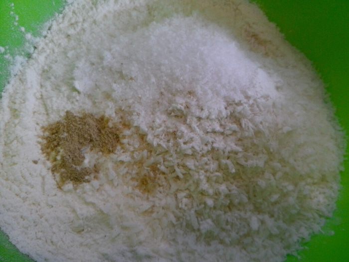 Отдельно смешать муку, ванильный сахар, разрыхлитель, имбирь и 50 грамм кокосовой стружки.