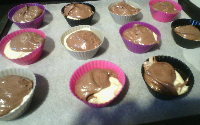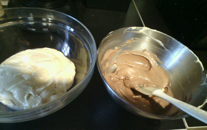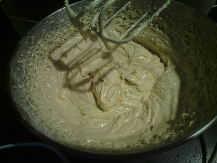 В глубокой посуде смешать масло (оно должно быть мягкое), сахар и ванильный сахар до крема. Добавить яйца. В другой посуде смешать муку и разрыхлитель, соединить с масляной массой. Все хорошо перемешать миксером, добавить сливки. Опять все хорошо перемешать.