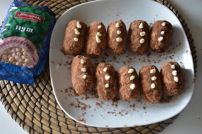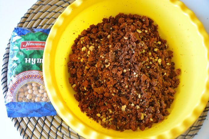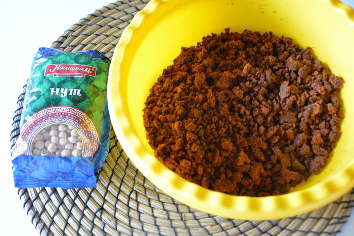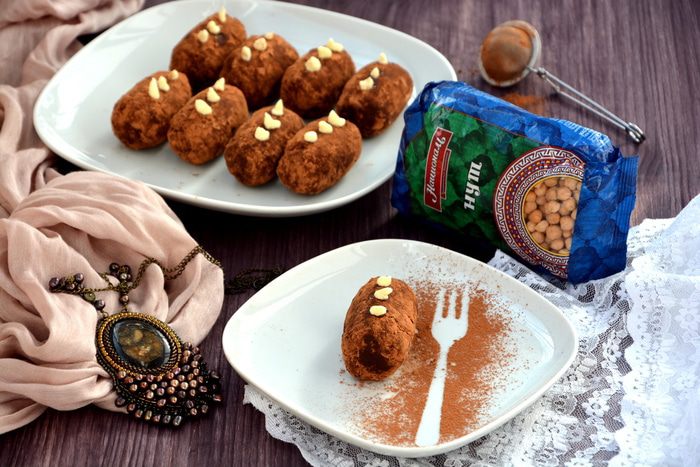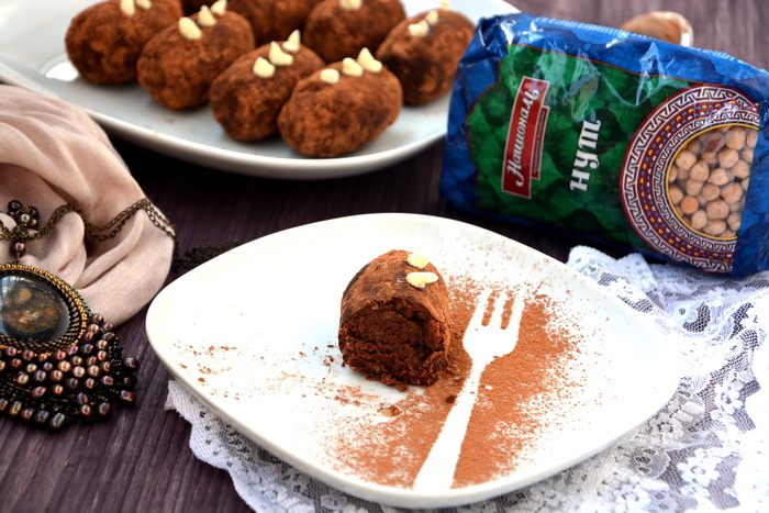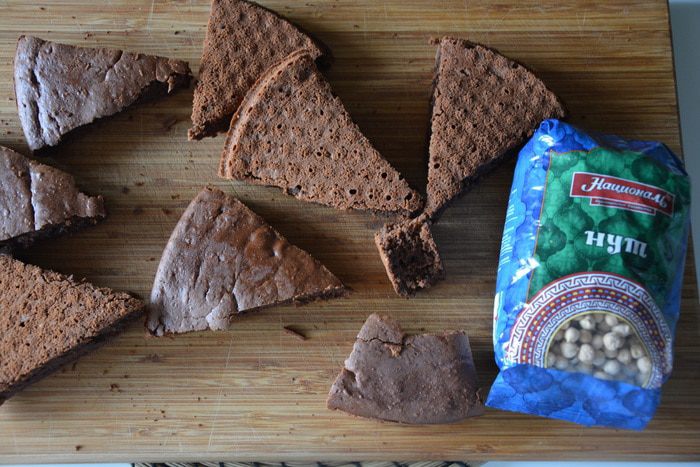 Пирожное готовится из шоколадного нутового бисквита, орехов и крема. Для ценителей настоящего горького шоколада. Нут незаметен во вкусе, он придает рыхлость и влажность текстуре бисквита.