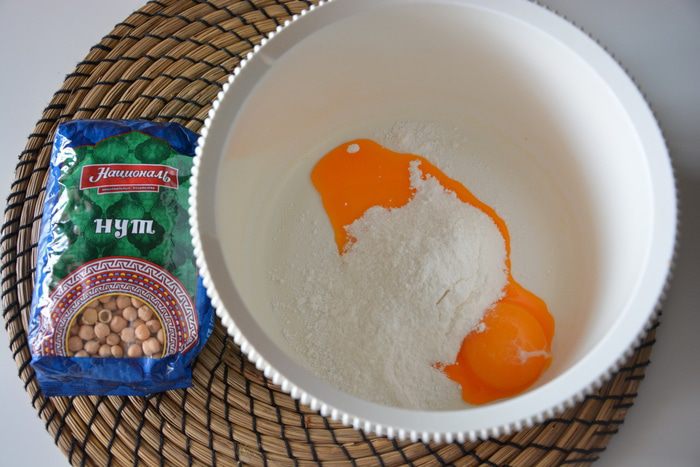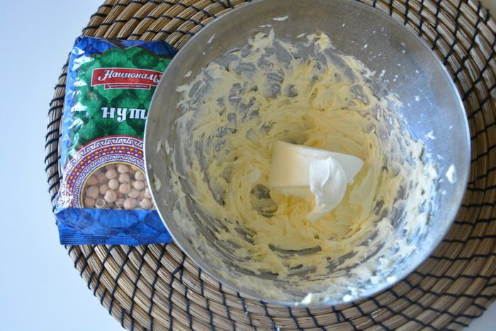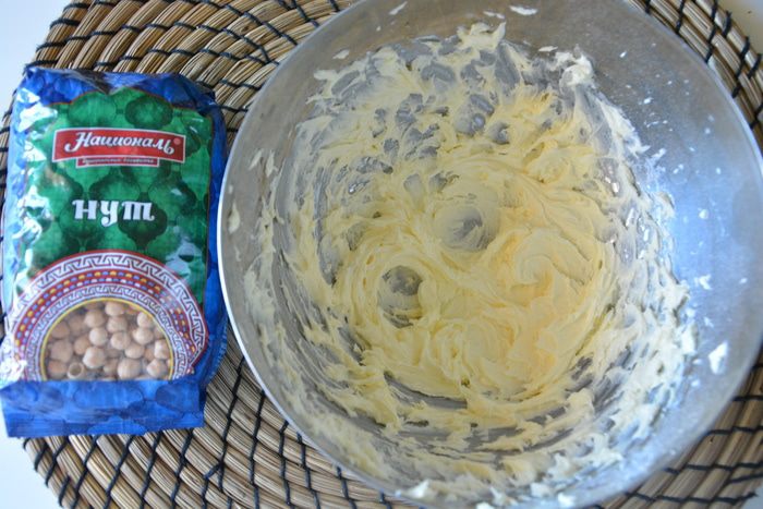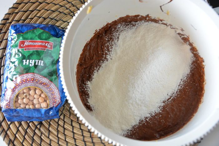 К нутовой массе добавить муку, просеянную с солью и разрыхлителем. Хорошо взбить миксером.