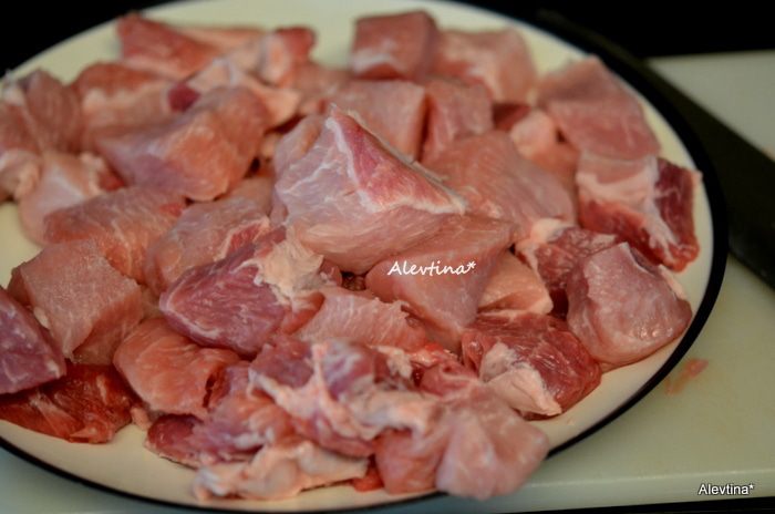 Нежную часть свинины, такую, как вырезка, разрежем на крупные кусочки.
