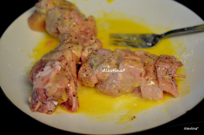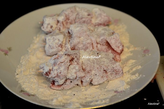 В муку добавить сухой тимьян, мясные специи по вкусу, кайенский перец щепотку. Обвалять каждый шашлык с 2 х сторон в муке со специями.