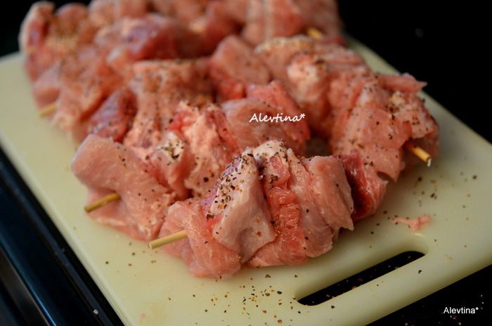 Палочки деревянные заранее замочить на 1 час. Нанизывать мясные кусочки на деревянные палочки.