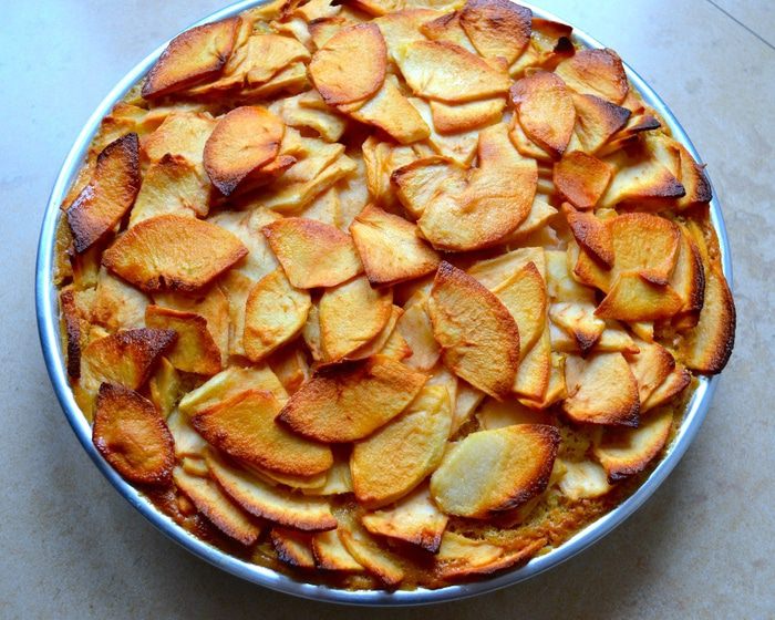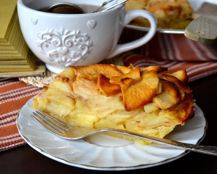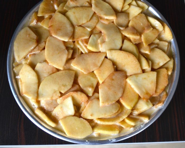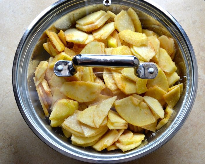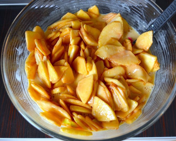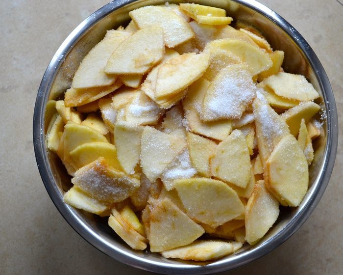 Яблоки подготовить заранее, за 1-2 часа до того, как Вы соберитесь печь пирог. Итак, яблоки лучше взять сорта ренет (или зеленые, типа Симиренко). Вымыть, очистить яблоки и нарезать на тонкие дольки толщиной примерно 2 мм. Выложить яблоки в миску и пересыпать сахаром. Осторожно перемешать, чтобы яблоки не поломались!