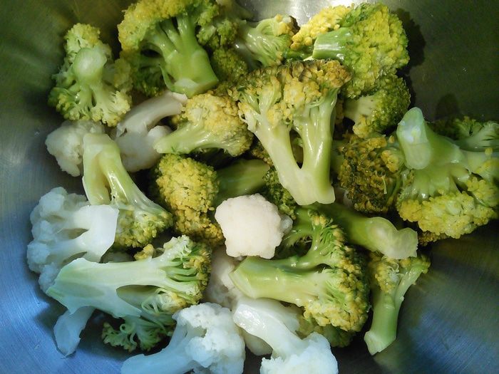 Брокколи отварите в слегка подсоленой воде в течении 5 минут, откиньте на дуршлаг, дайте стечь воде, охладите. У меня скучал в холодильнике кусочек цветной капусты, я пустила его в салат.