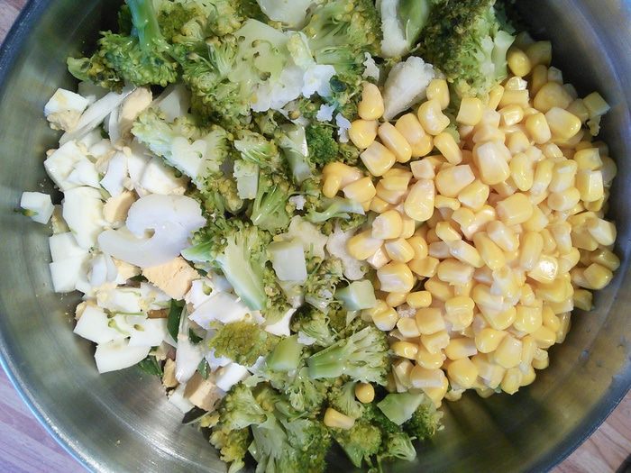 Брокколи нарежьте на мелкие соцветия, петрушку порубите, все ингредиенты сложите в миску, добавьте кукурузу.