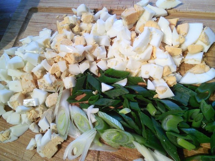 Яйца и зелёный лук мелко порубите.