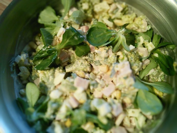 Теперь осталось посолить, поперчить, сдобрить майонезом 50/50 смешанным с йогуртом и аккуратно перемешать.