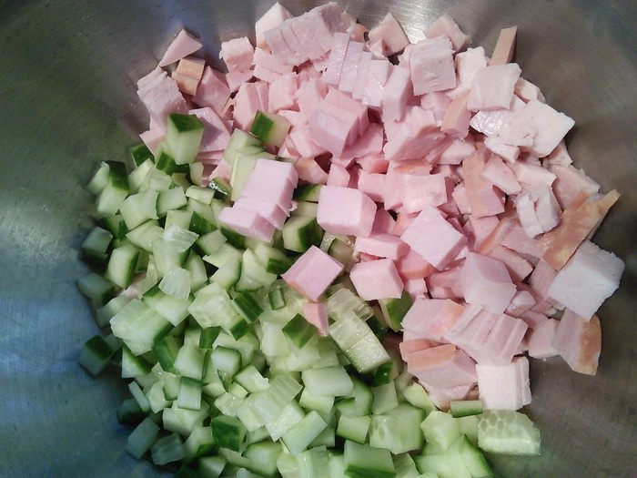 Ветчину (можно заменить на вареное мясо) нарежьте кубиком. Огурец свежий или соленый также нарежьте кубиком.
