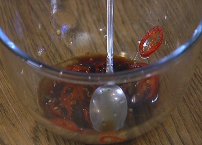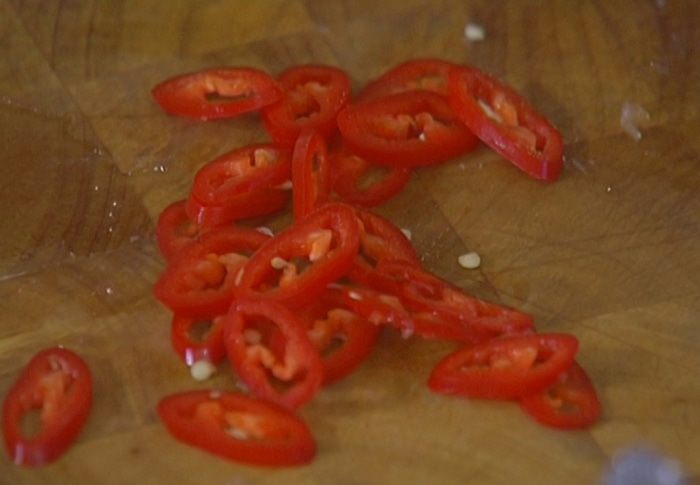 Перец чили вместе с семенами нарезать тонкими кольцами.