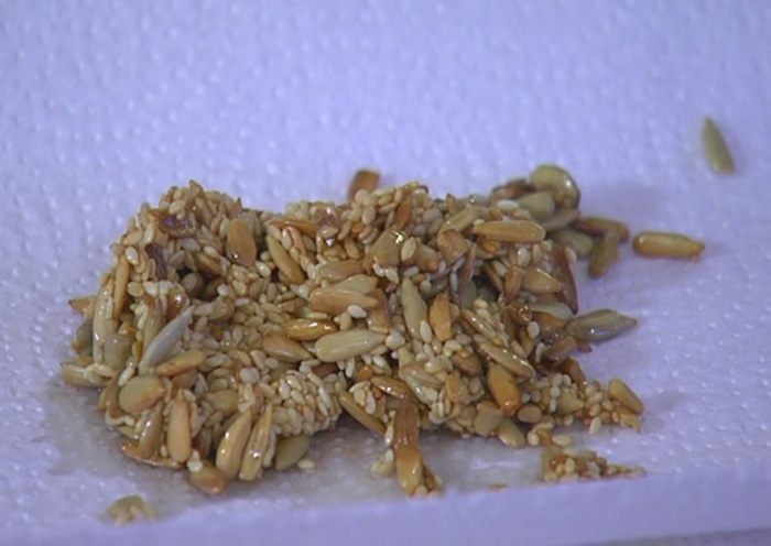 Разогреть в сковороде растительное масло, всыпать семечки, посолить, затем добавить кунжут и обжарить все до золотистого цвета. Выложить семена на бумажное полотенце, чтобы удалить излишки масла.