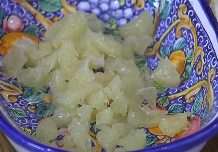 Помело очистить от кожуры и пленок, мякоть разделить на небольшие кусочки и выложить в блюдо.