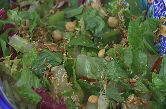Посыпать салат обжаренным кунжутом, семечками и фундуком, украсить листьями мяты.