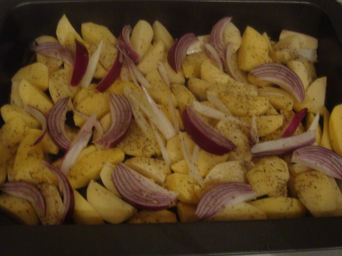 В противень выложить картошку и порезать луковицу. Запекать в духовке до румяной корочки, постоянно помешивая.