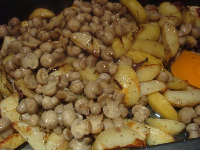 Когда картошка подрумянится, добавить грибы, хорошо перемешать. Посыпать травами, если нужно еще посолить.