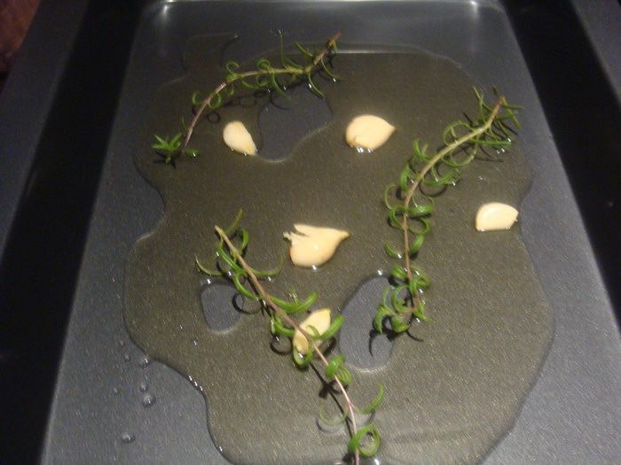 На противень налить растительного масла, положить чеснок и розмарин. Противень поставить в духовку на 5 минут, прогреть, чтобы чеснок и розмарин отдали свой аромат маслу.