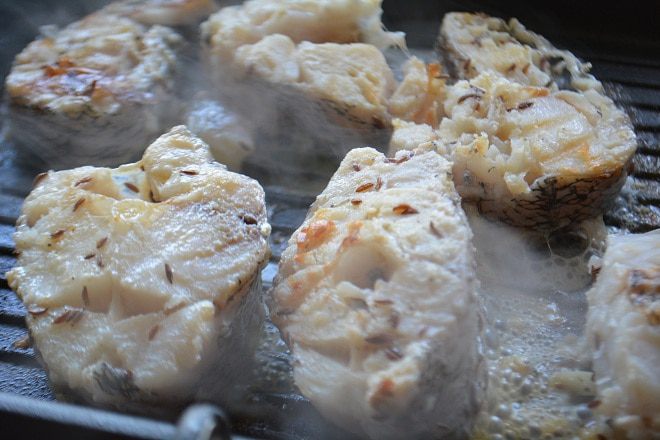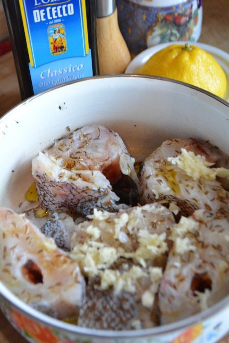 Смешать маринад: оливковое масло, тмин, чеснок через пресс, перец свежемолотый, сок 0,5 лимона. Залить им рыбу и перемешать. Оставить мариноваться минимум 30 минут.