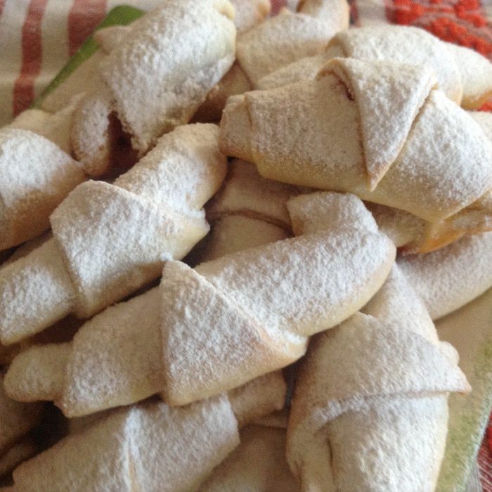Если Вы используете все тесто (это где-то 2 противня изделий), поделите его на 6 равных частей, если, как я половину, значит на 3. Скатайте шарики, раскатайте один из них, остальные на время уберите в холодильник. Далее стандартная схема изготовления рогаликов: раскатать круг, поделить на 8 частей, положить начинку (в оригинале варенье из лепестков роз, любое другое густое варенье и даже обычный сахар) и скрутить рогалик. На просыпанный мукой противень выложить изделия и отправить в разогретую до 180 градусов духовку, печь до золотистой корочки. Еще теплыми обвалять в сахарной пудре! Есть, когда остынут!