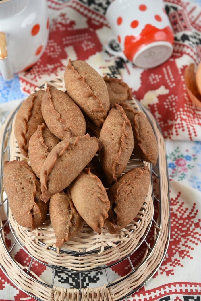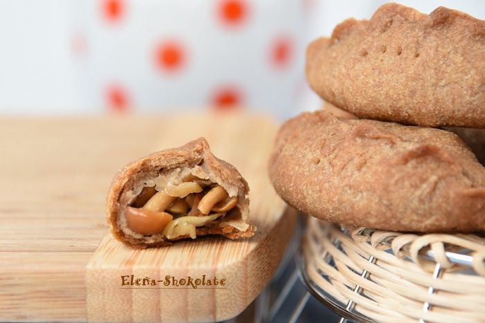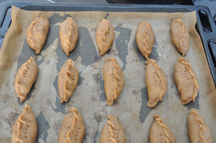 Края хорошо защипнуть. Переложить пирожки на застеленный пергаментом противень, наколоть тесто вилкой для выхода пара и выпекать около 30 минут при температуре 180 градусов.