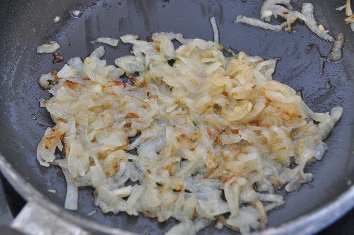 Займемся начинкой. Две средних луковицы нарезать полукольцами. Обжарить до золотистости на растительном масле на среднем огне.