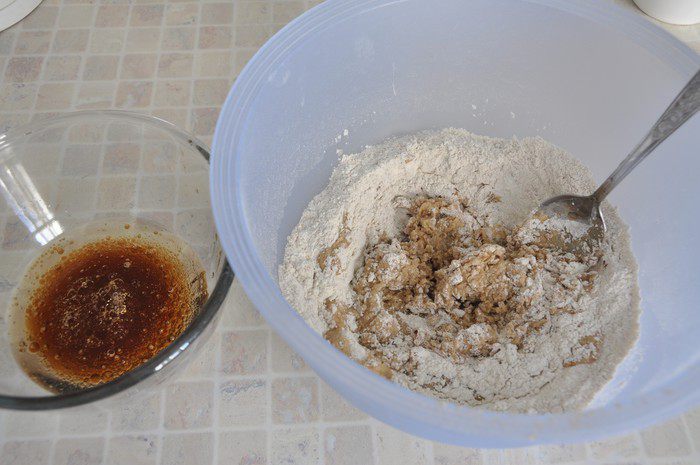 Добавлять жидкую часть в муку, ложкой замешивая тесто. Если тесто будет слишком мягким, добавить еще муки. Мне понадобилось добавить еще 2 столовых ложки муки (я добавляла ржаную).