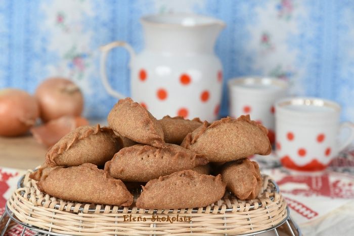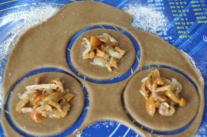 Включить разогреваться духовку до температуры 180 градусов. Тесто раскатать толщиной 3-4 мм, выемкой вырезать круги. Посередине положить начинку.