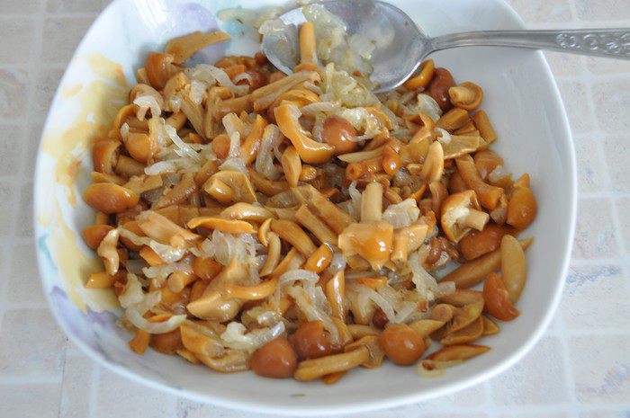 Лук перемешать с опятами, немного поперчить.