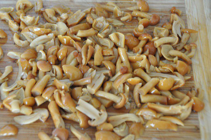 Маринованные грибочки процедить от маринада. Крупные грибы не мелко порезать.