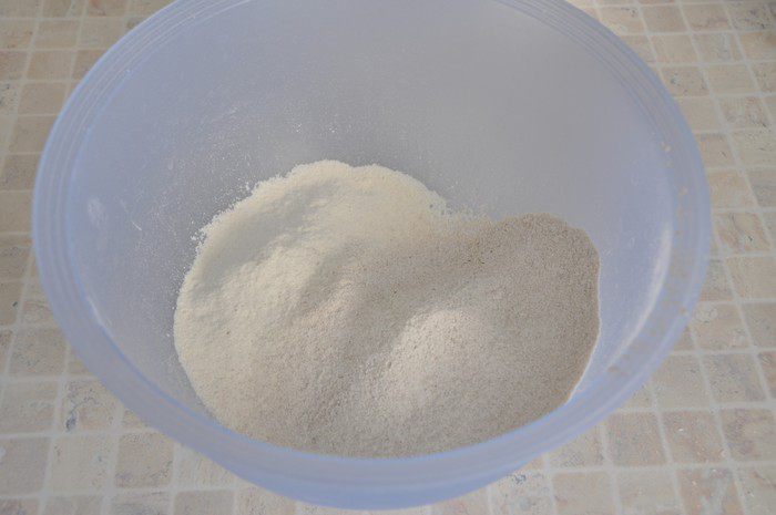 В большую миску просеять два вида муки и добавить соль. (Если квас уже давно стоит открытым, то добавить 1 чайную ложку разрыхлителя).