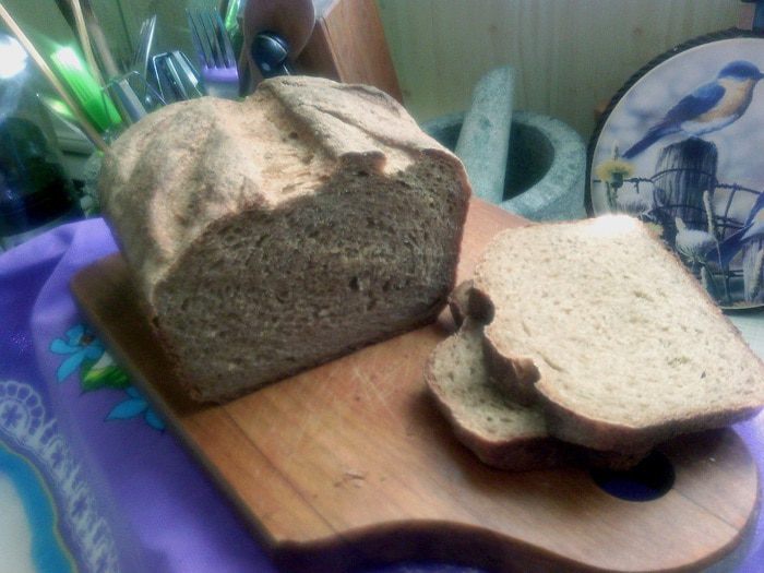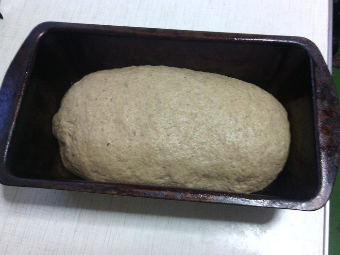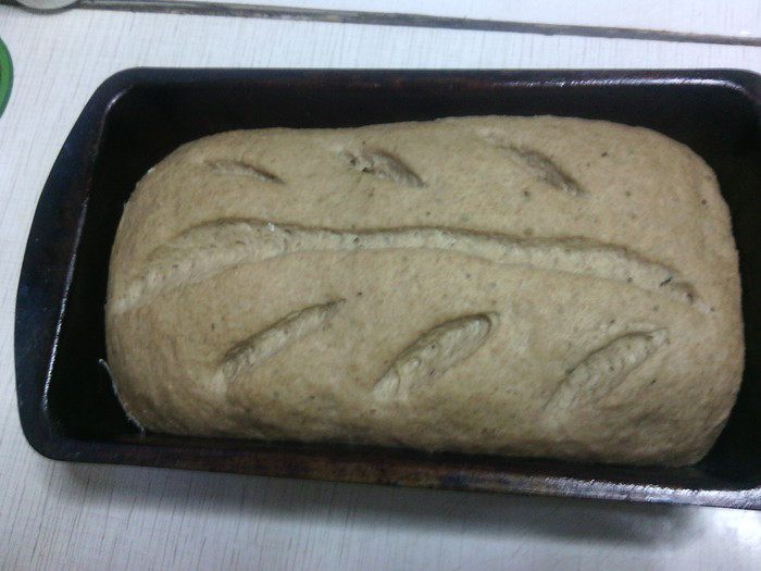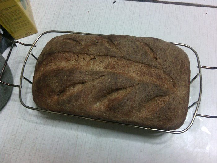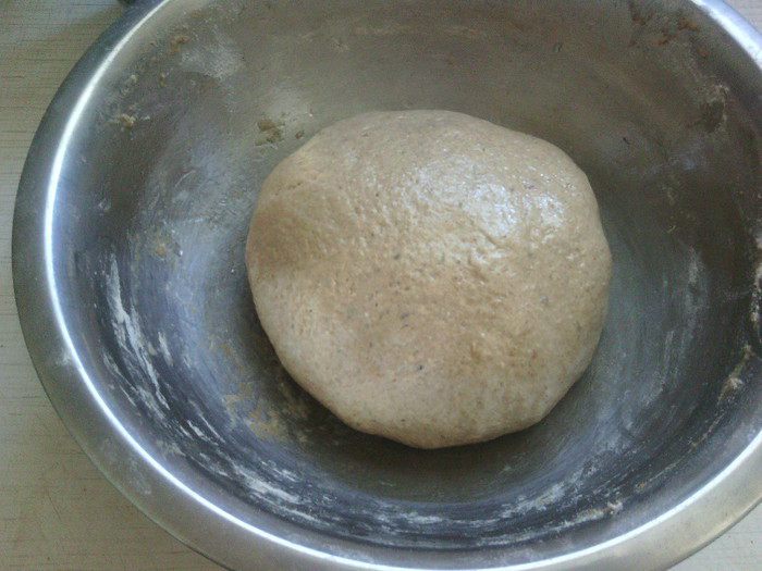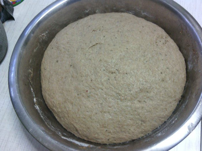 В миску просеять три вида муки, добавить соль, дрожжи и специи - всё перемешать. Затем влить солодовую водичку с мёдом, добавить опару - замесить тесто.