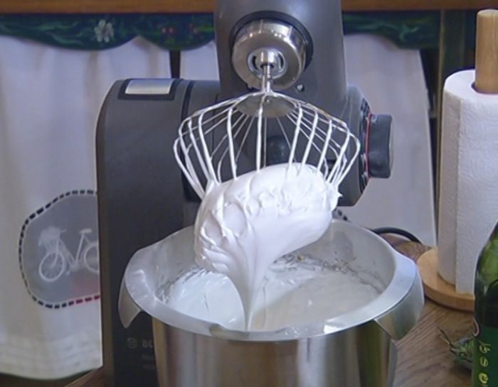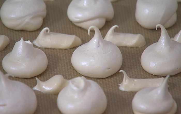 Грамотная меренга — хрустящая снаружи и мягкая, слегка тягучая и нежная внутри. Есть несколько секретов при приготовлении меренг: белки нужно отделить от желтков за пару дней до приготовления десерта; белки должны быть хорошо охлаждены; белки нужно сначала взбить в воздушную массу, затем по одной ложке ввести сахарную пудру; обязательно нужна кислая среда — надо добавить яблочный или уксус белого вина; духовка не должна быть слишком горячей — я ее разогреваю до 150 градусов, но, когда ставлю противень в духовку, понижаю температуру до 120 градусов и выпекаю меренги около часа, а большие меренги можно оставить в духовке на ночь. Если смазать плоскую сторону меренг растопленным шоколадом и соединить по две вместе, получится пирожное «Поцелуйчик».