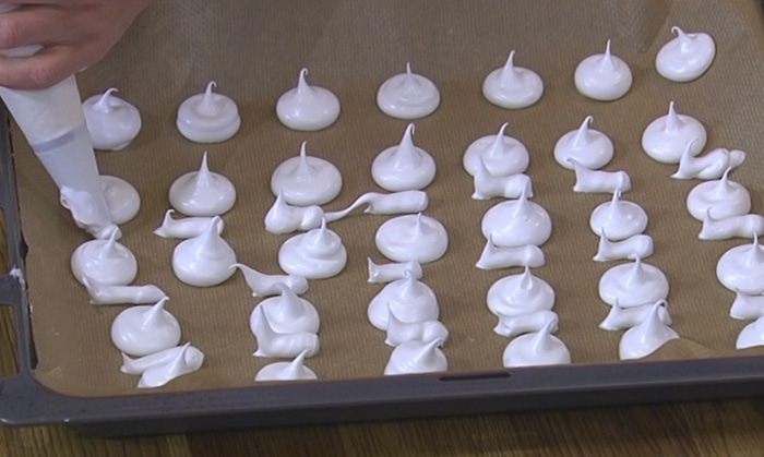 Белковую массу выложить в кондитерский мешок и отсадить на противень небольшие круглые меренги (это будут шляпки грибов) и продолговатые меренги (будущие ножки).