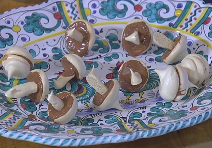 Плоскую часть круглых меренг смазать растопленным шоколадом и воткнуть ножки грибов — пока меренги теплые, это сделать легко!