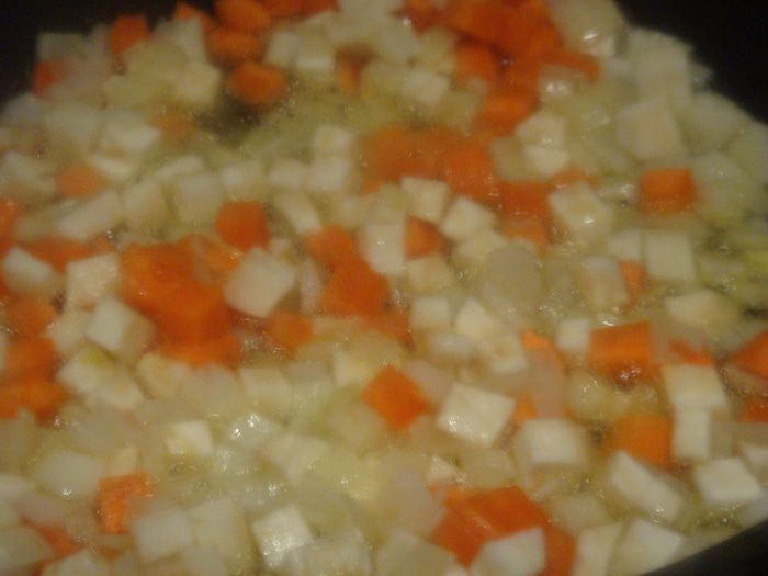 Разогреваем сковороду, наливаем сливочное масло, пассируем лук добавляем морковь и корень сельдерея (сельдерей я добавила по своей инициативе), можно не добавлять. Протушить 2-3 минуты.