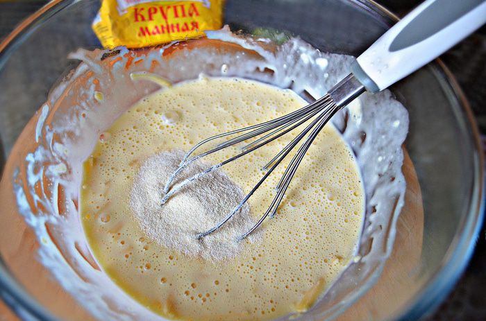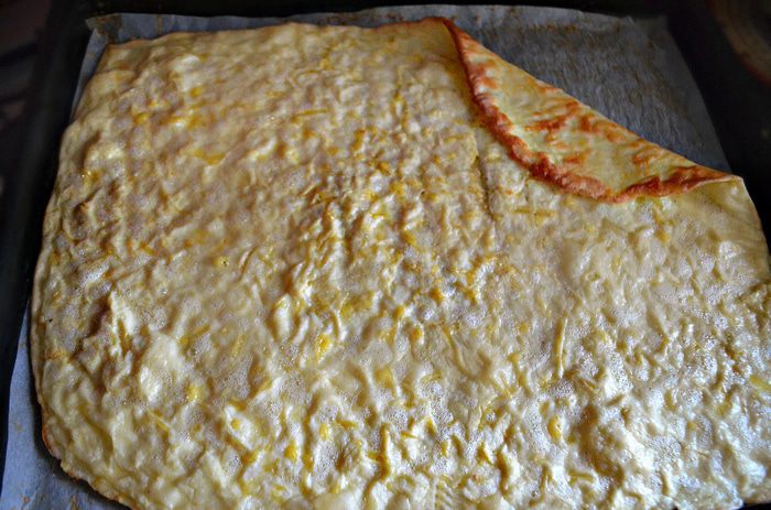 Противень застелить бумагой для выпечки и слегка смазать растительным маслом. Вылить тесто. Тесто жидкое, поэтому для удобства, чтобы тесто не выливалось, края бумаги лучше слегка подвернуть, формируя бортики.
