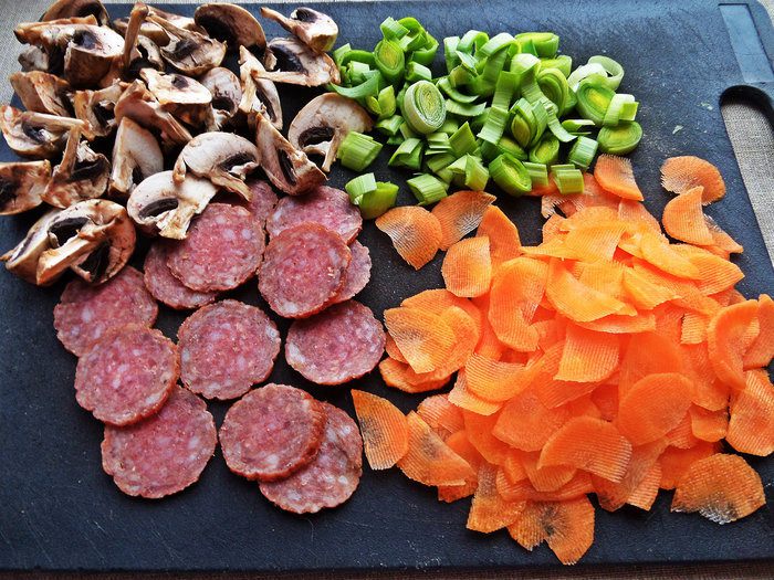 Начинаем подготовку салатика. Шампиньоны разрежем на четверти, порей на кольца, морковку на полукруги слайсами строгаем, салями - тонкими кружками.