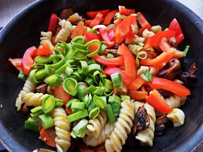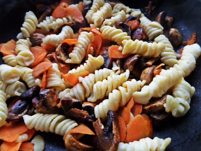 Затем к ним высыпаем фузилли, прогреем немного вместе на огне.