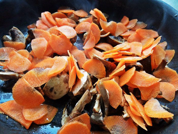 Морковь и грибы обжариваем в вытопившемся жирке от салями сразу, не выключая огня.