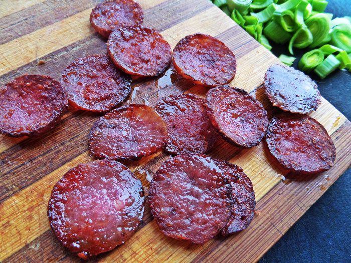 Салями обжариваем на сухой сковороде, вынимаем на салфетку или доску.
