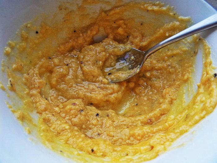 Смешать с маслом, горчицей, соком и специями.
