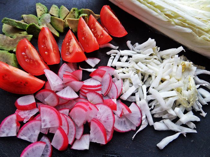 Нарезаем остальные овощи: капусту, редиску, авокадо, помидоры.